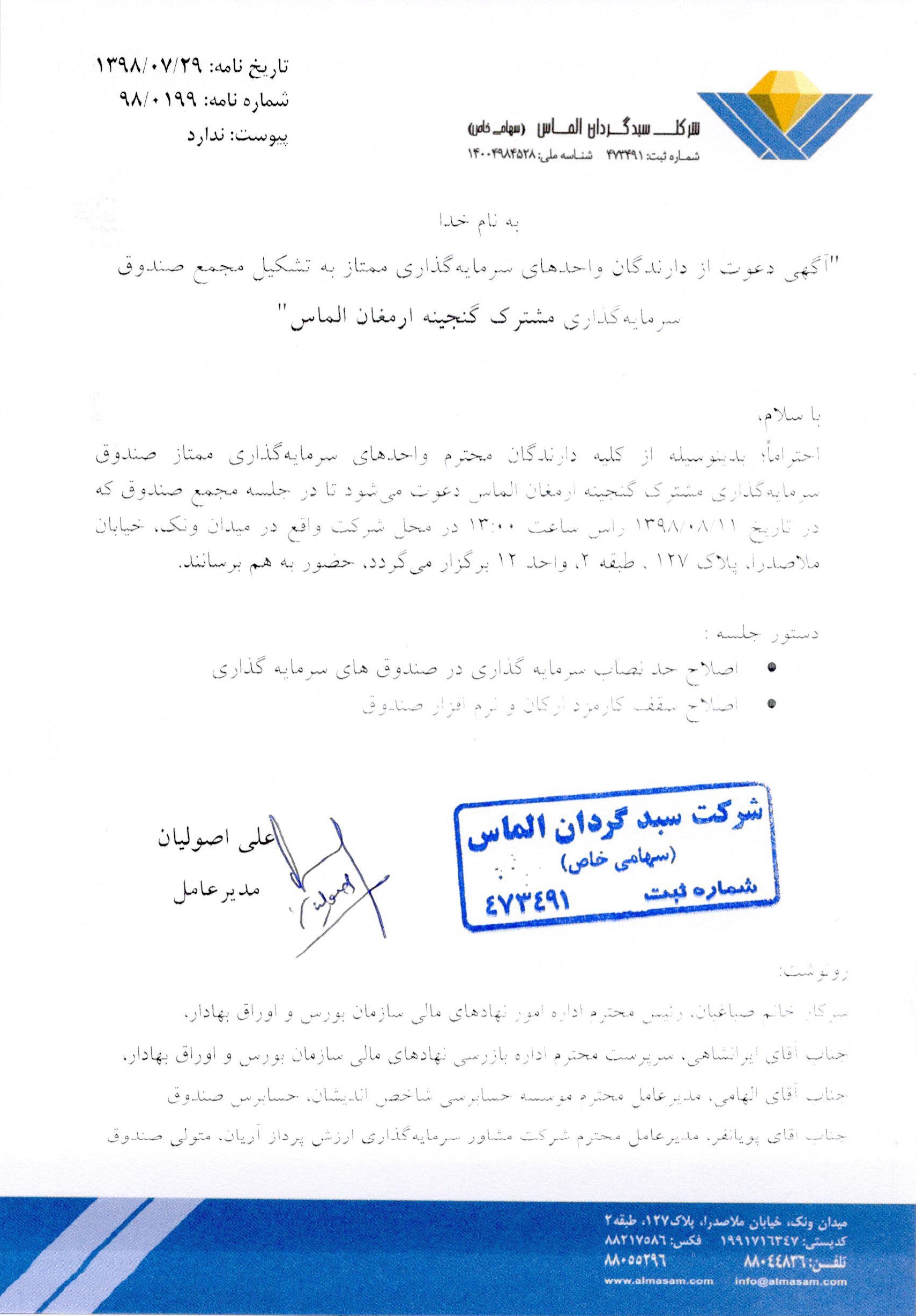 آگهي دعوت از دارندگان واحدهاي سرمايهگذاري ممتاز به تشكيل مجمع صندوق سرمايهگذاري مشترك گنجينه ارمغان الماس مورخ 1398/05/22 ساعت 13 بعذ از ظهر