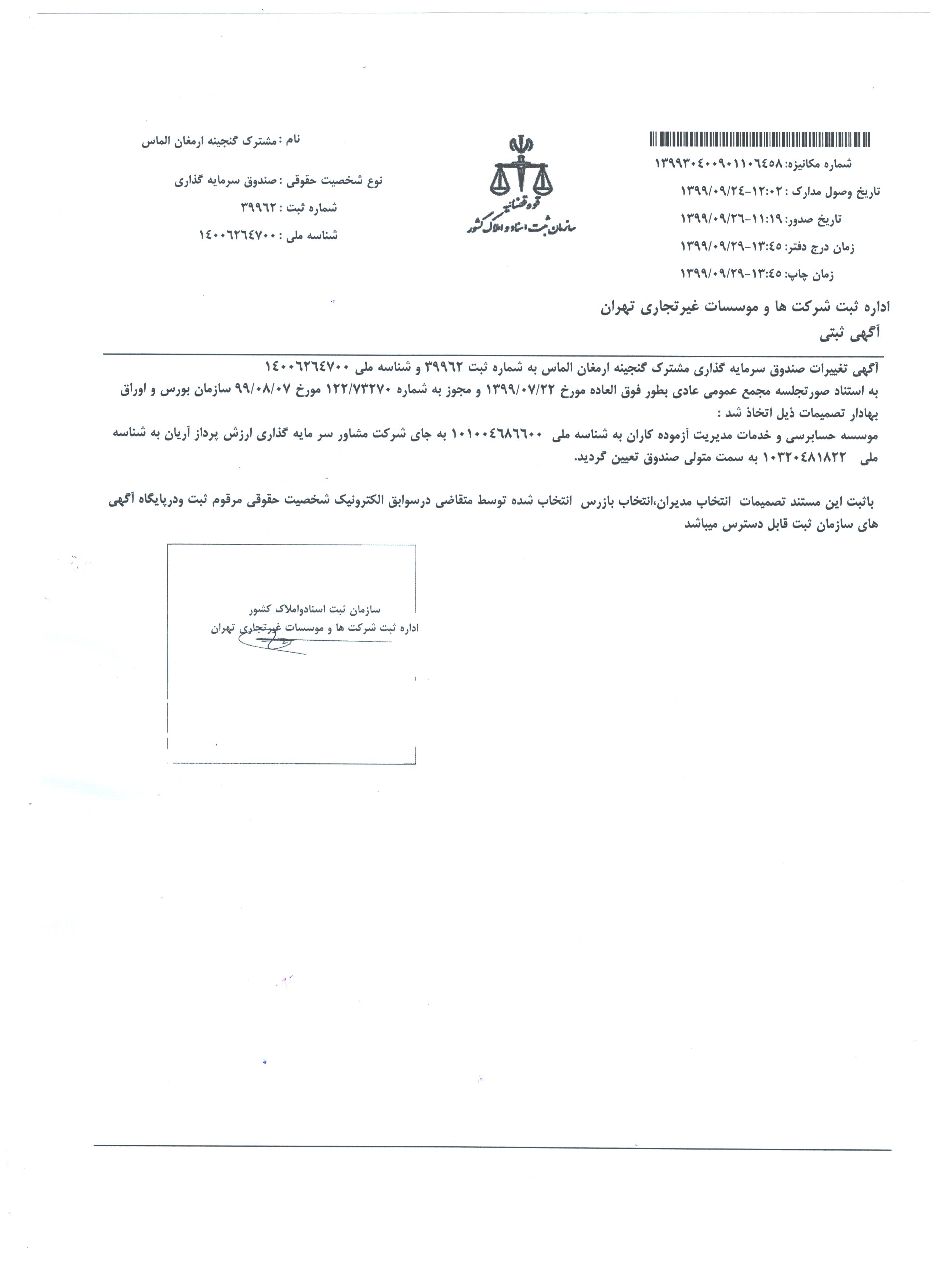 آگهی ثبت صورتجلسه مجمع مورخ 1399/07/22 تمدید دوره صندوق