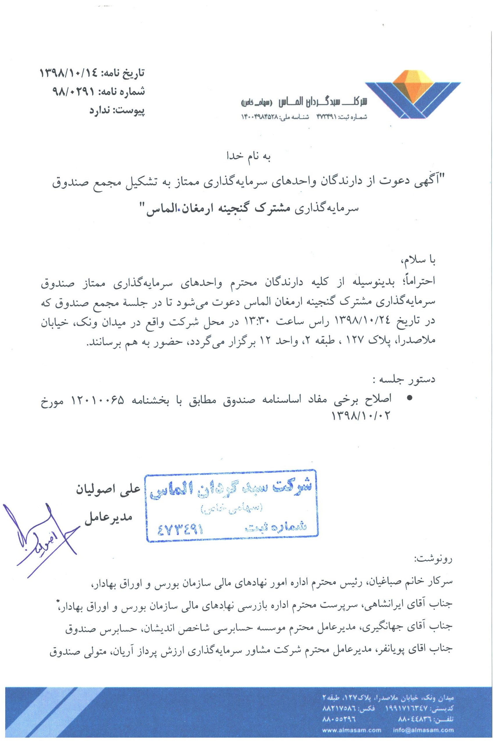 آگهی دعوت به مجمع صندوق گنجینه ارمغان الماس مورخ 1398/10/24ساعت 13-اصلاح برخی مفاد امیدنامه